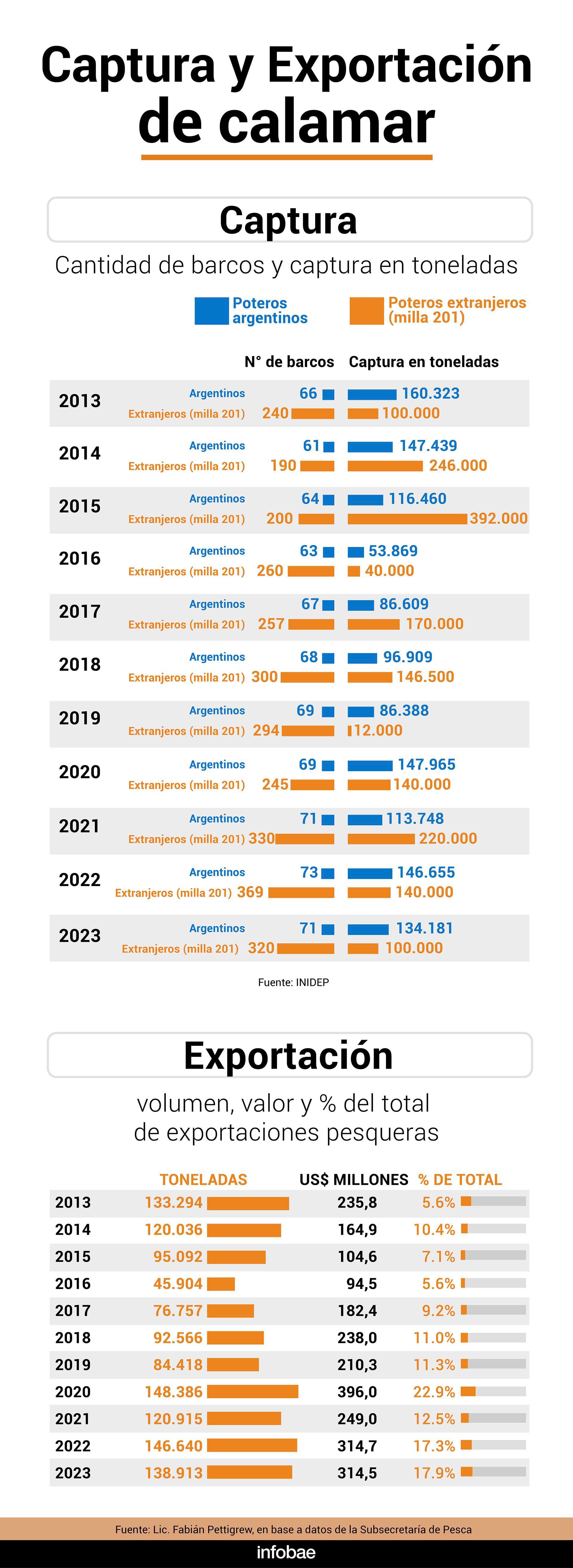 Los datos aportados por Ivanovic son claros al respecto. Según las estimaciones del Inidep, entre 2013 y 2023, mientras los buques de bandera argentina pescando en la ZEEA capturaron 1,29 millones de toneladas de calamar, la flota extranjera capturó en la “Milla 201″ más de 1,7 millones de toneladas, un 32% más. En 2021, por caso, la flota extranjera casi duplicó la pesca de calamar realizada en el Mar Argentino. Y en 2015 más que la triplicó.