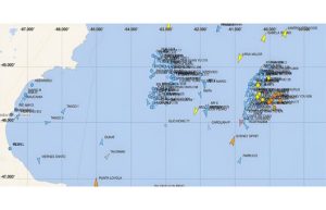En el escenario de monitoreo del Atlántico Sur se observa con claridad una alta densidad de poteros argentinos operando aproximadamente entre los 44°40′S y 45°53′S, y los 62°30′W y 63°30′W, a unas 90–110 millas náuticas al Este de Camarones. En las mismas latitudes, pero por fuera de la Zona Económica Exclusiva Argentina (ZEEA), se aprecia la presencia de flota extranjera, con antecedentes inmediatos (hasta el viernes) de capturas y tallas sensiblemente menores.